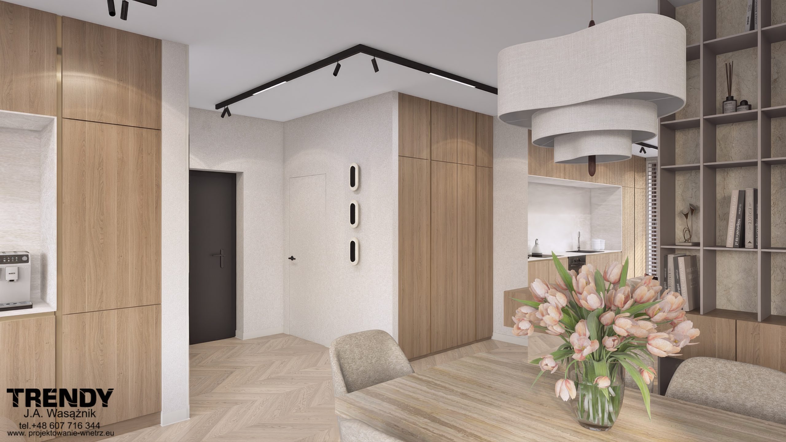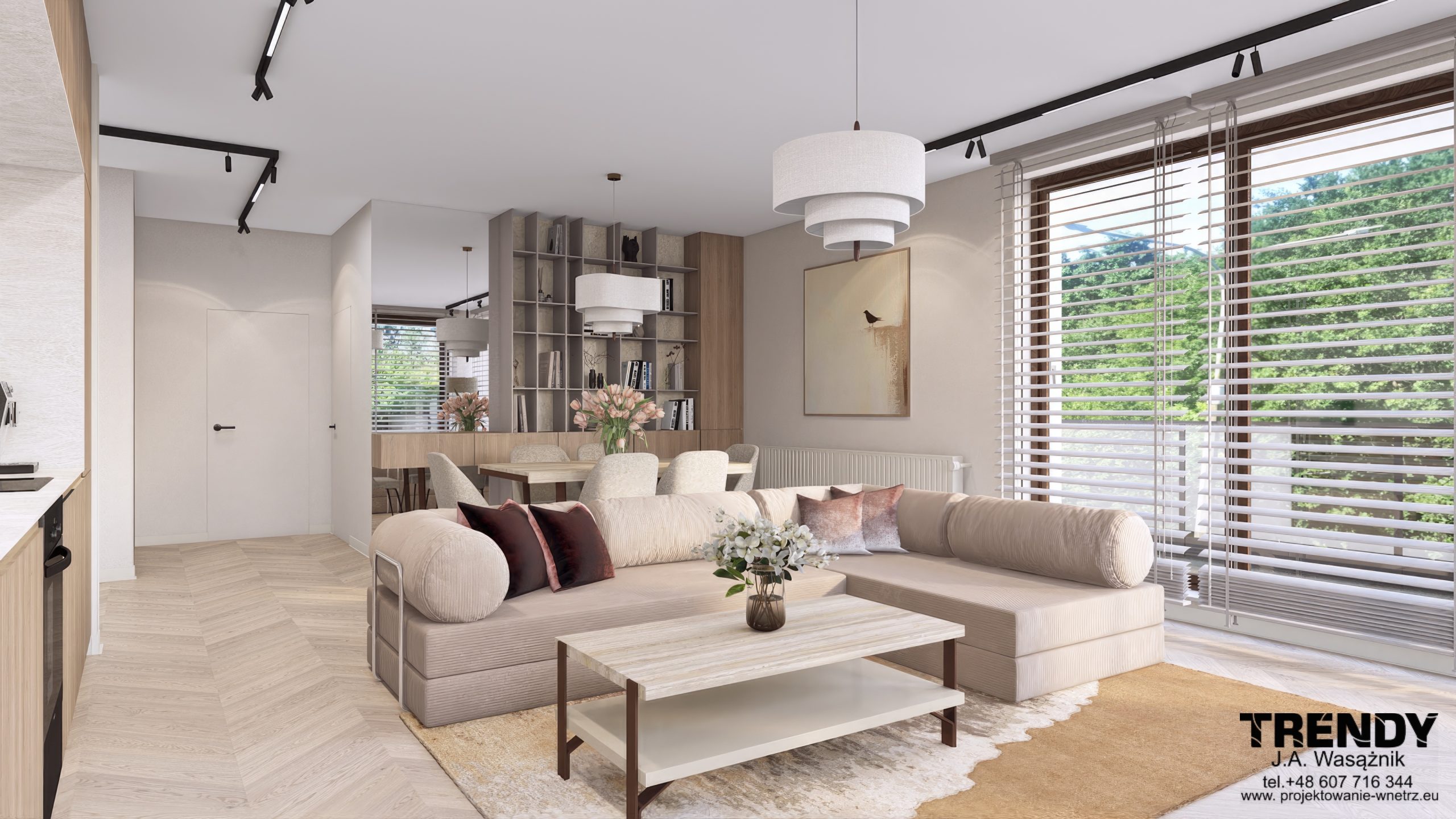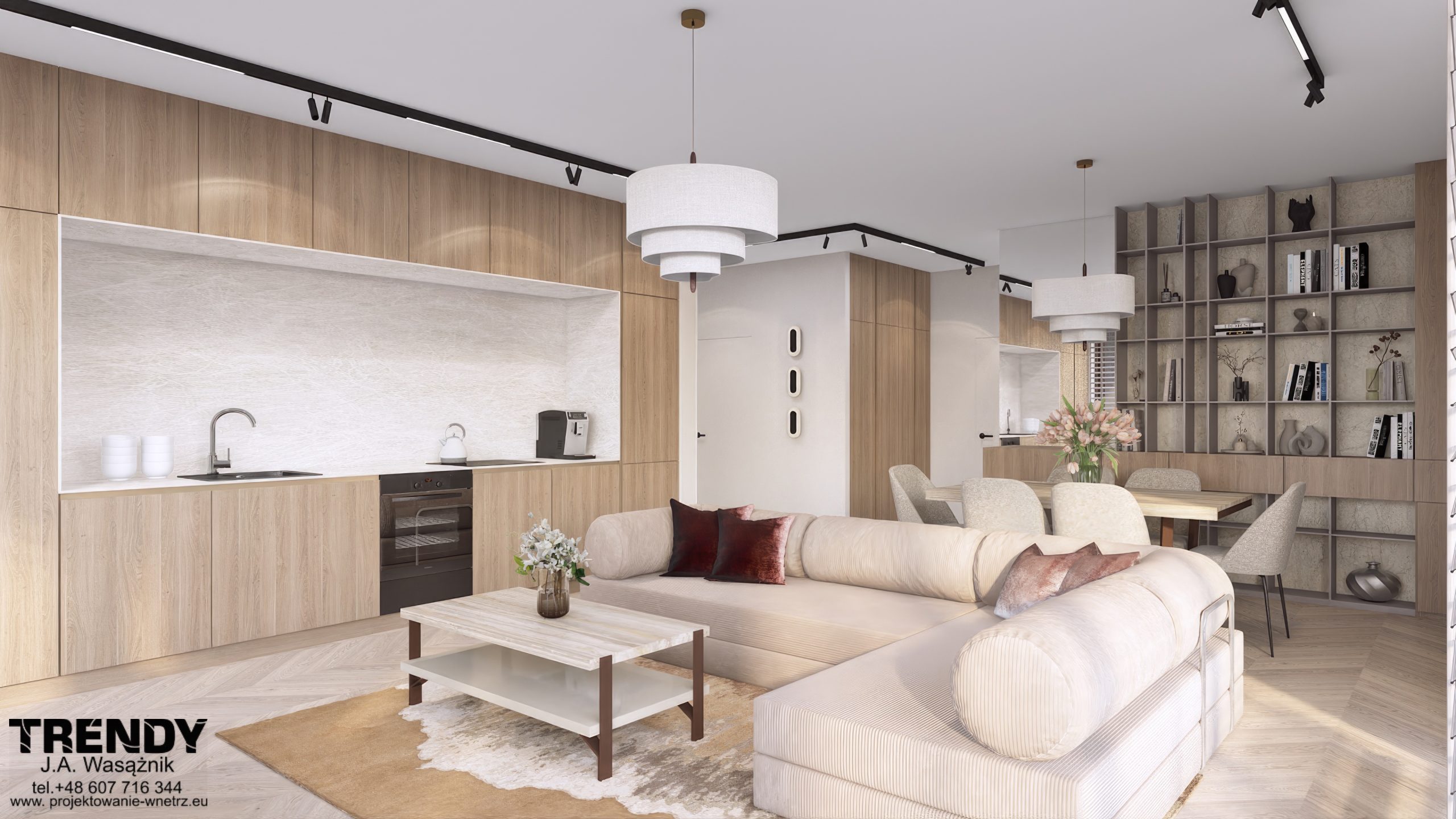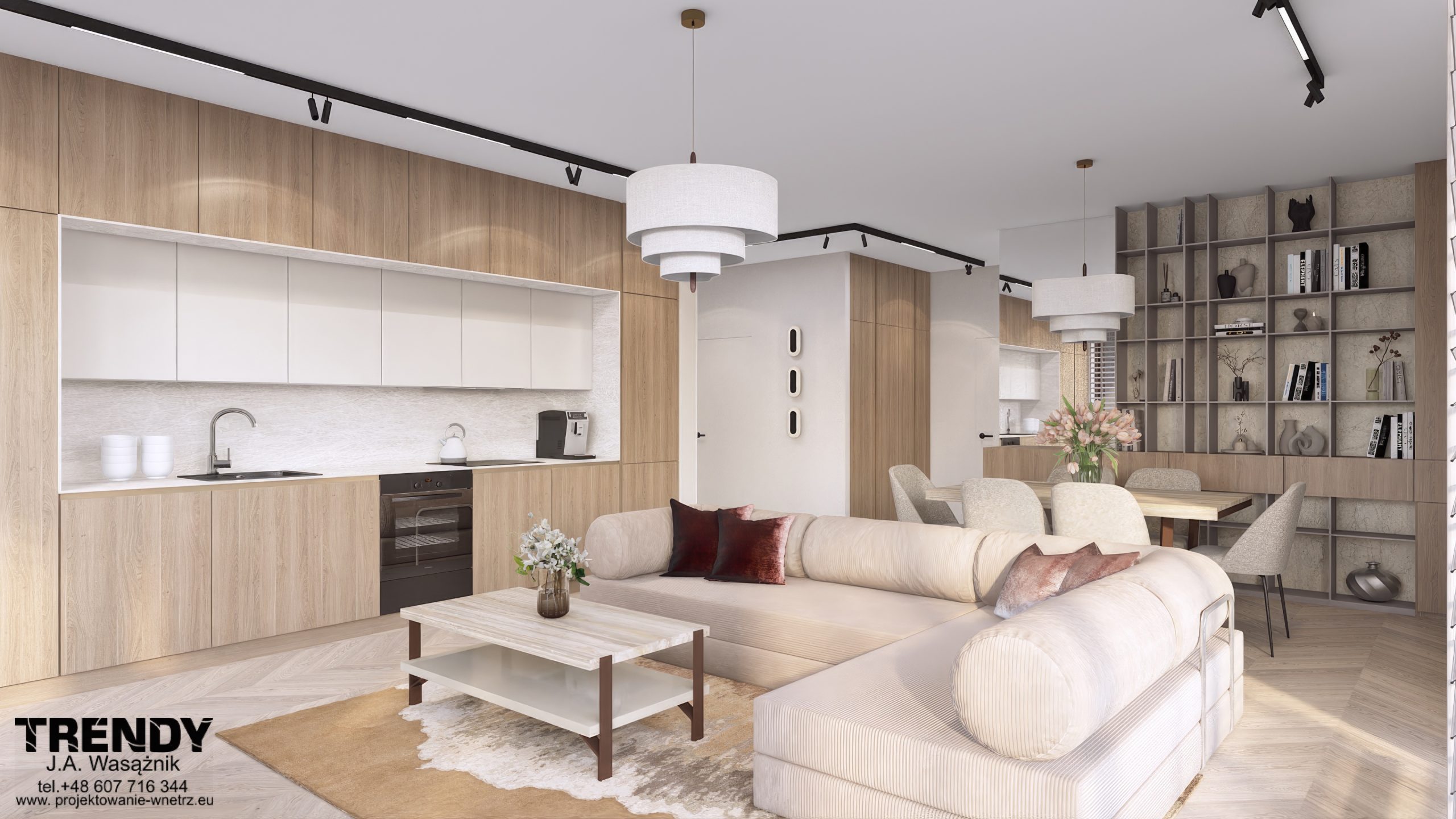Otwarta przestrzeń dzienna, która jest kwintesencją nowoczesnej elegancji i przemyślanego designu, a jej siła tkwi w harmonii kolorów i materiałów. Wnętrze to charakteryzuje się neutralną i kojącą paletą barw, gdzie dominują ciepłe odcienie naturalnego drewna (dąb, beż) zestawione z jasnym kolorem szafek kuchennych oraz jasnymi, kremowymi tekstyliami obszernej sofy, co nadaje całości wyjątkowego ciepła. Elementy kontrastu, takie jak czarne detale szyn oświetleniowych i opraw lamp, wprowadzają nowoczesny, graficzny akcent, który podkreśla geometrię przestrzeni. Mimo otwartego planu, przestrzeń jest maksymalnie funkcjonalna dzięki wyraźnemu podziałowi na strefy w tle widzimy elegancki kącik jadalniany. Zastosowanie gładkich frontów w kuchni i wysoki regał w tle, będący jednocześnie biblioteczką i dekoracyjną ścianą, maksymalizują miejsce do przechowywania,. Całość dopełniają miękkie tekstury sofy, dywanu i bordowych poduszek, tworząc przytulne wnętrze. W mieszkaniu znajduje się ponadto : sypialnia i łazienka