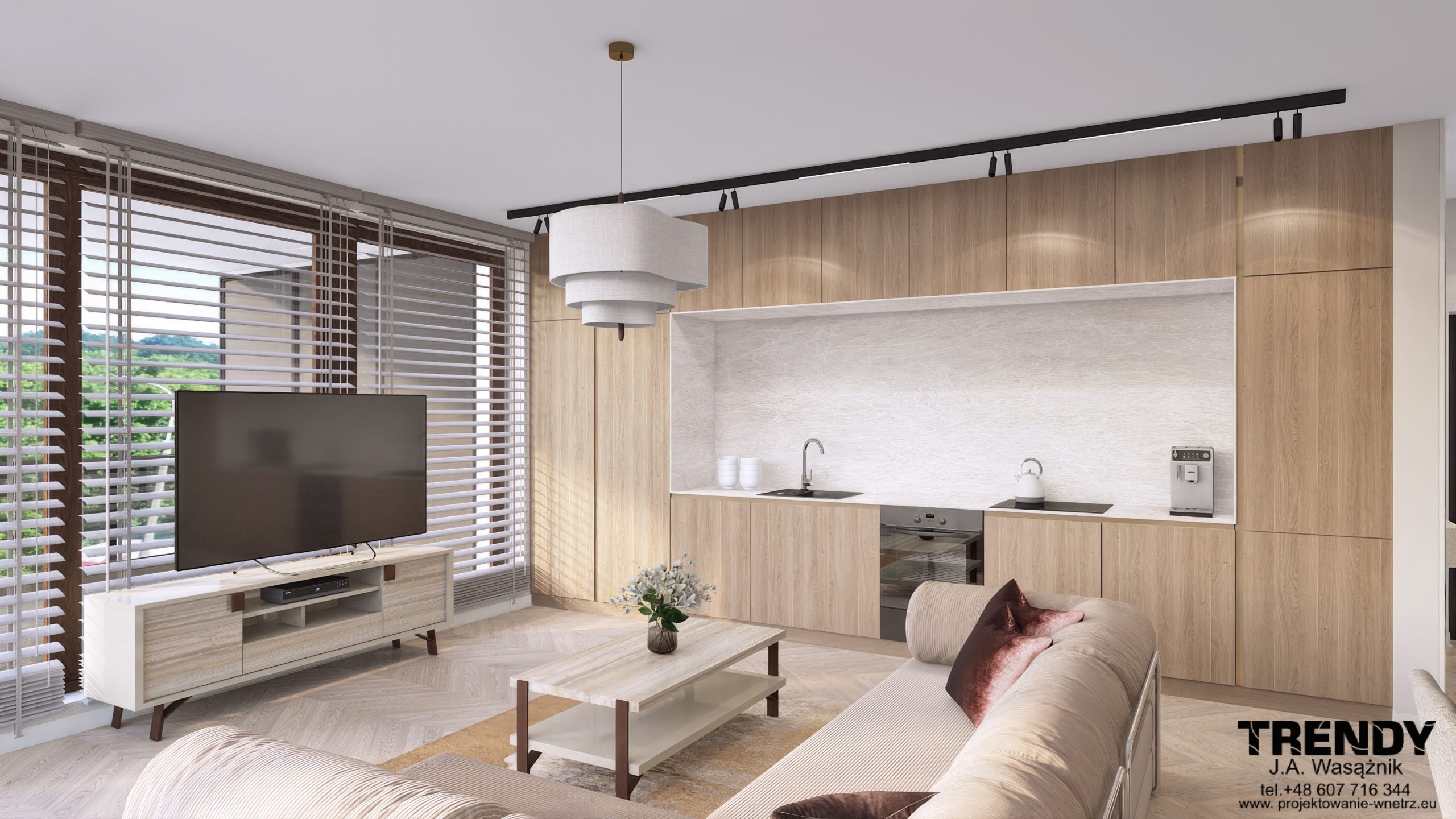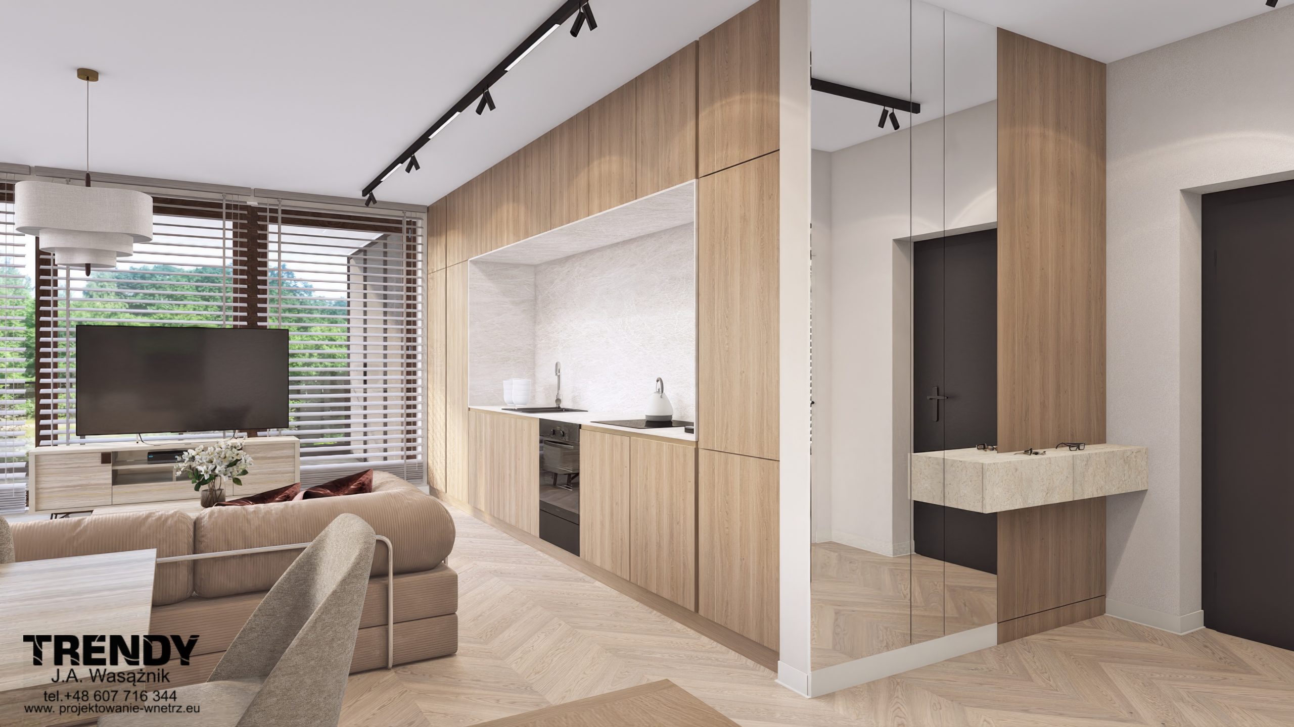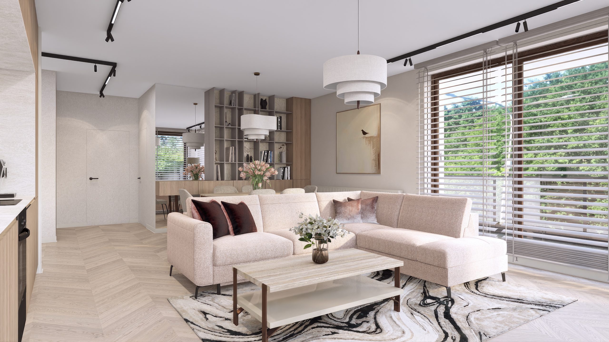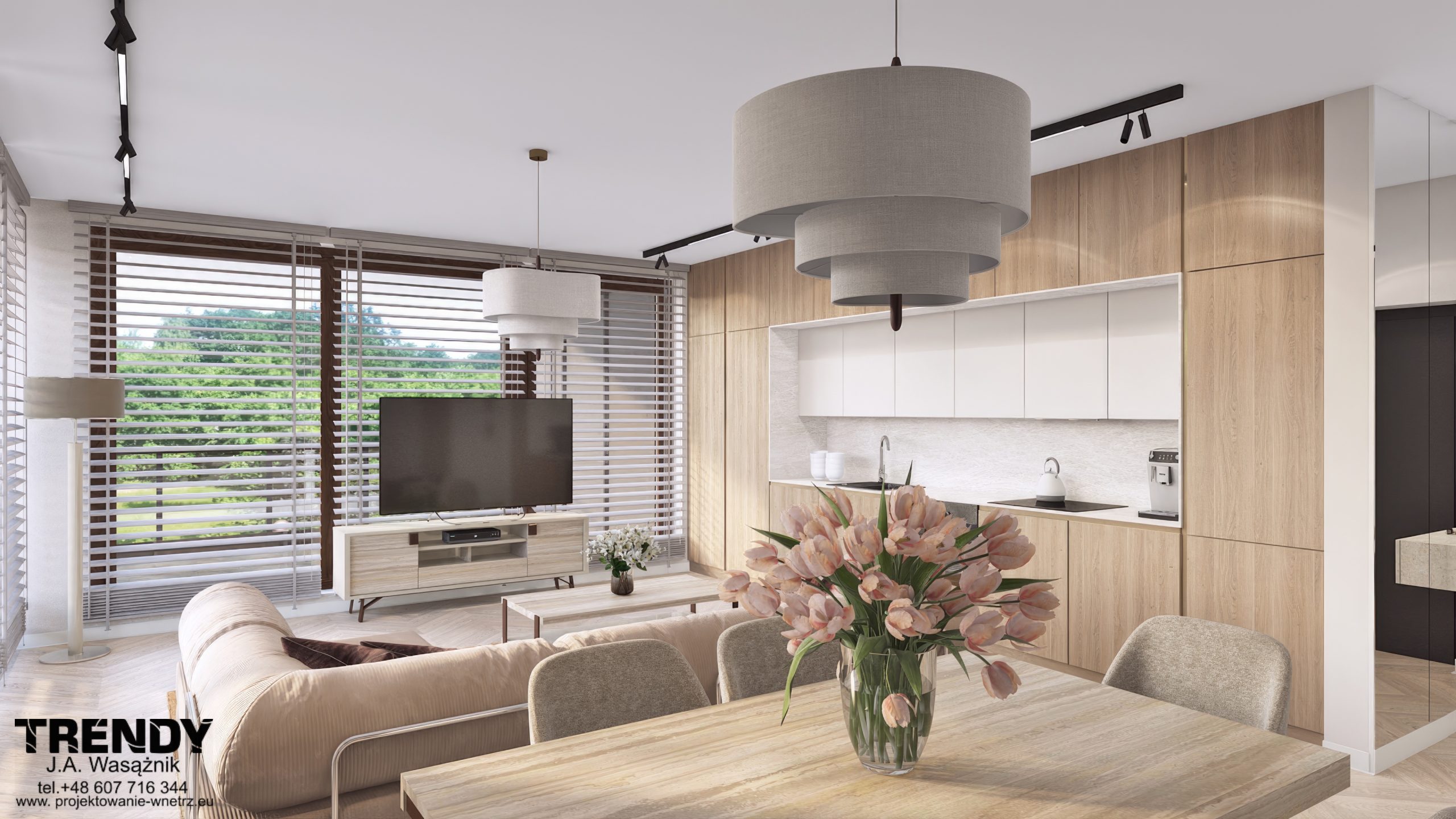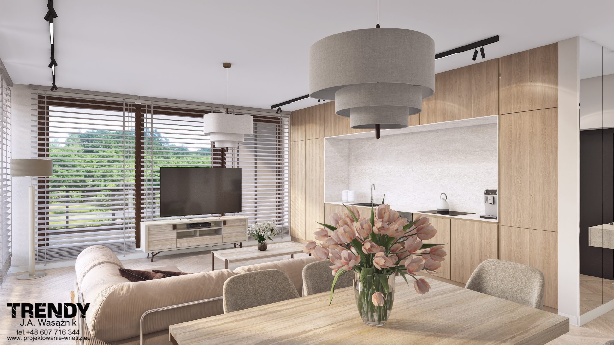 Otwarta przestrzeń dzienna, która jest kwintesencją nowoczesnej elegancji i przemyślanego designu, a jej siła tkwi w harmonii kolorów i materiałów. Wnętrze to charakteryzuje się neutralną i kojącą paletą barw, gdzie dominują ciepłe odcienie naturalnego drewna (dąb, beż) zestawione z jasnym kolorem szafek kuchennych oraz jasnymi, kremowymi tekstyliami obszernej sofy, co nadaje całości wyjątkowego ciepła. Elementy kontrastu, takie jak czarne detale szyn oświetleniowych i opraw lamp, wprowadzają nowoczesny, graficzny akcent, który podkreśla geometrię przestrzeni. Mimo otwartego planu, przestrzeń jest maksymalnie funkcjonalna dzięki wyraźnemu podziałowi na strefy w tle widzimy elegancki kącik jadalniany. Zastosowanie gładkich frontów w kuchni i wysoki regał w tle, będący jednocześnie biblioteczką i dekoracyjną ścianą, maksymalizują miejsce do przechowywania,. Całość dopełniają miękkie tekstury sofy, dywanu i bordowych poduszek, tworząc przytulne wnętrze. W mieszkaniu znajduje się ponadto : sypialnia i łazienka