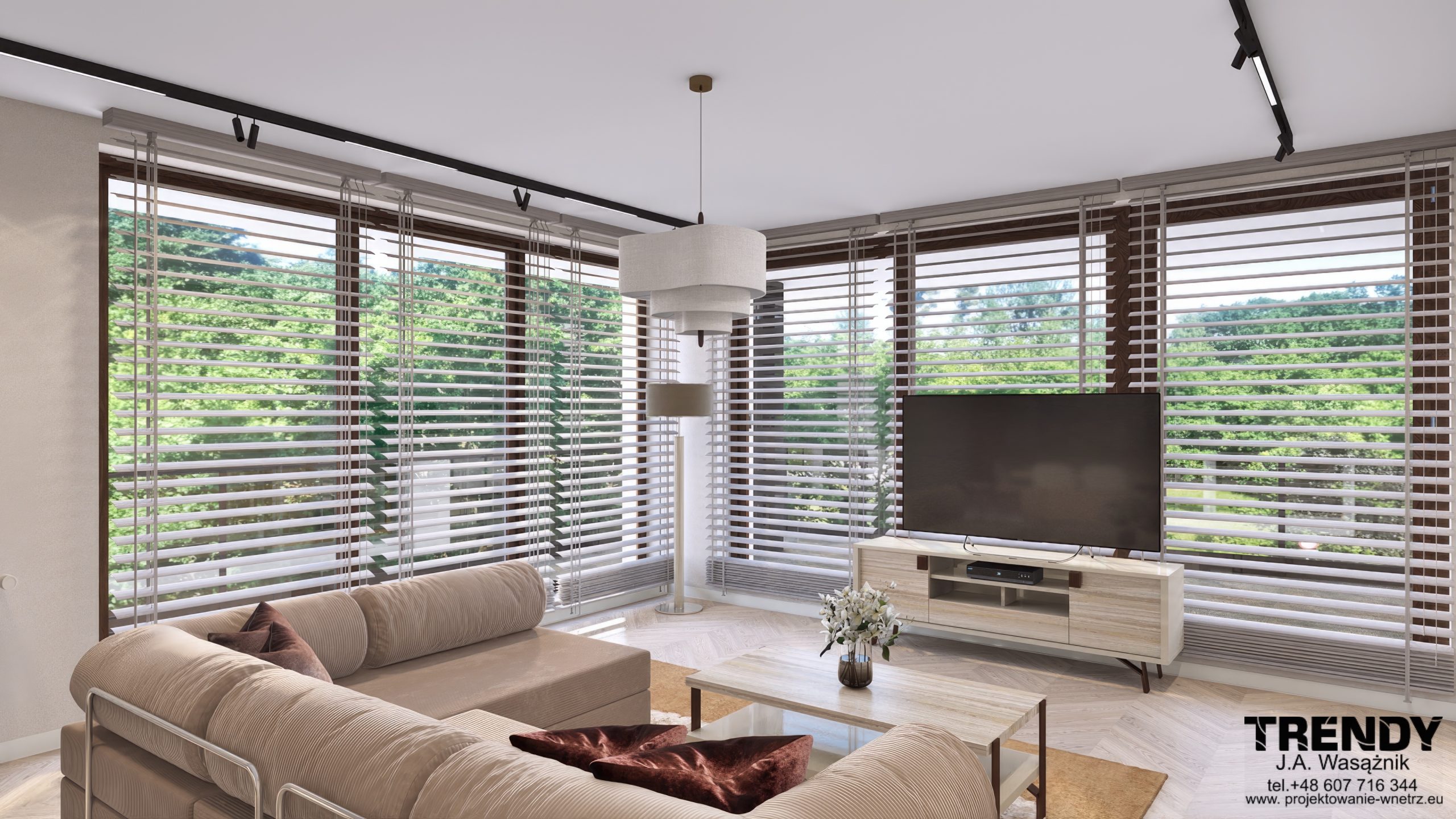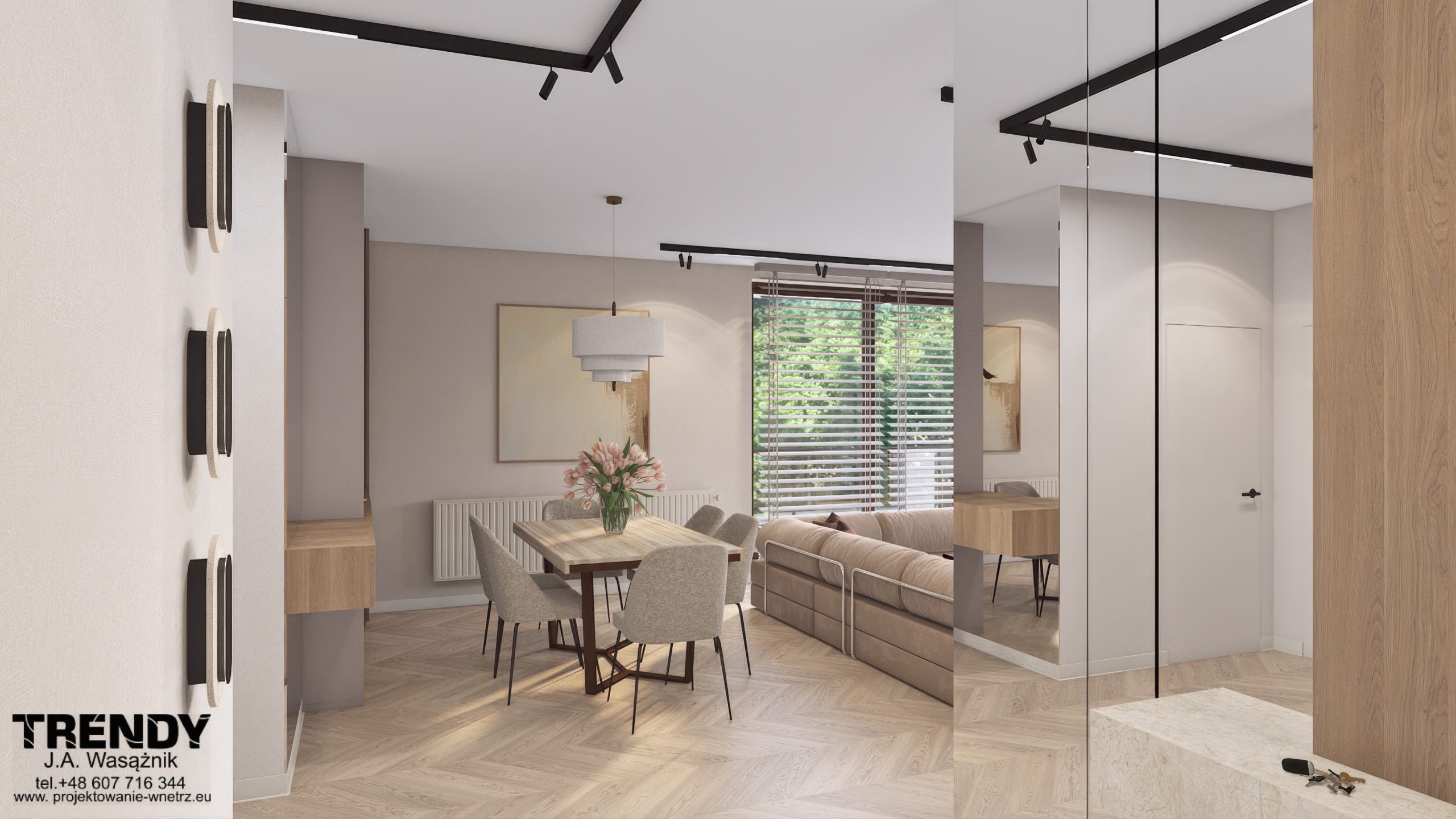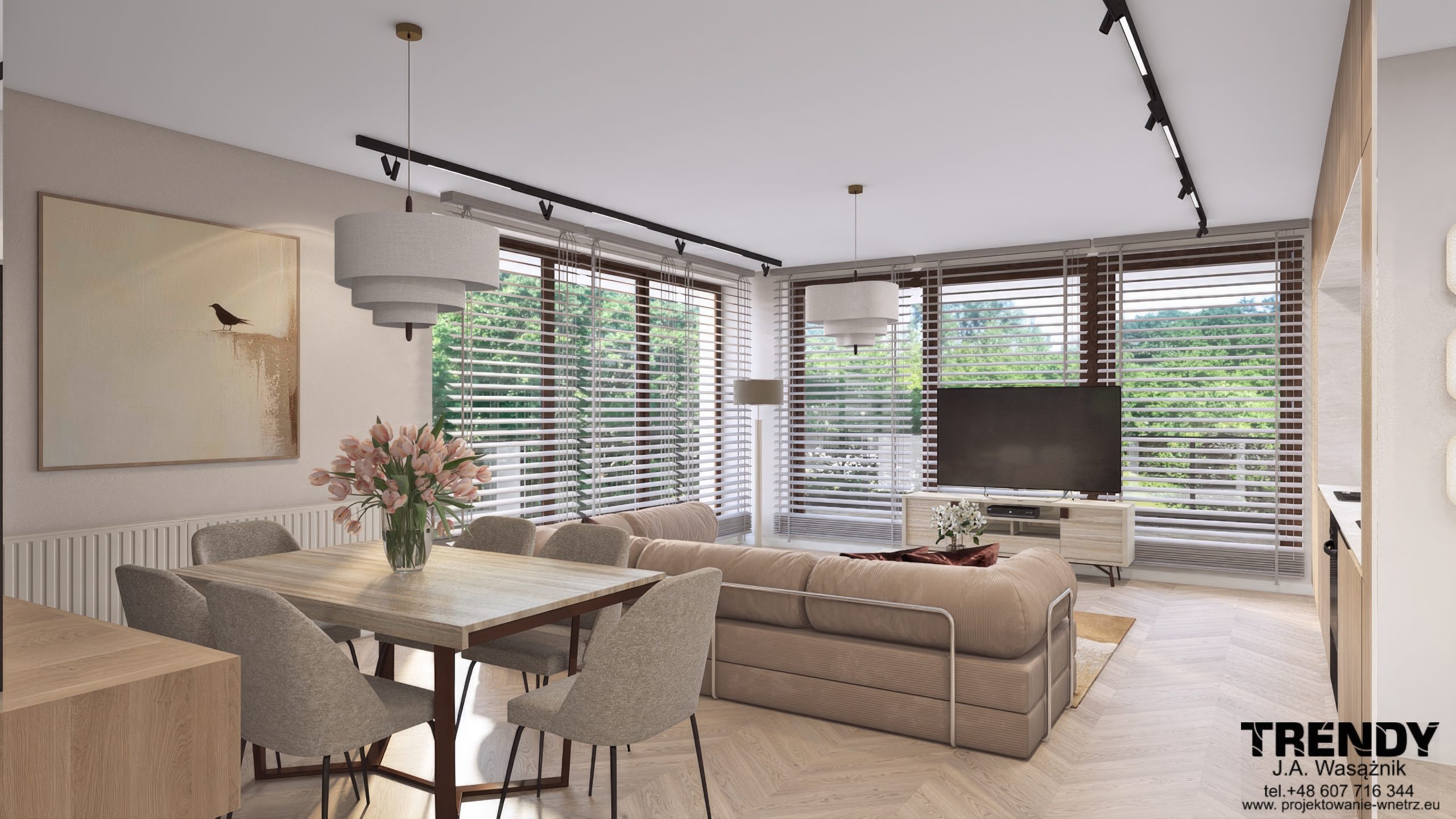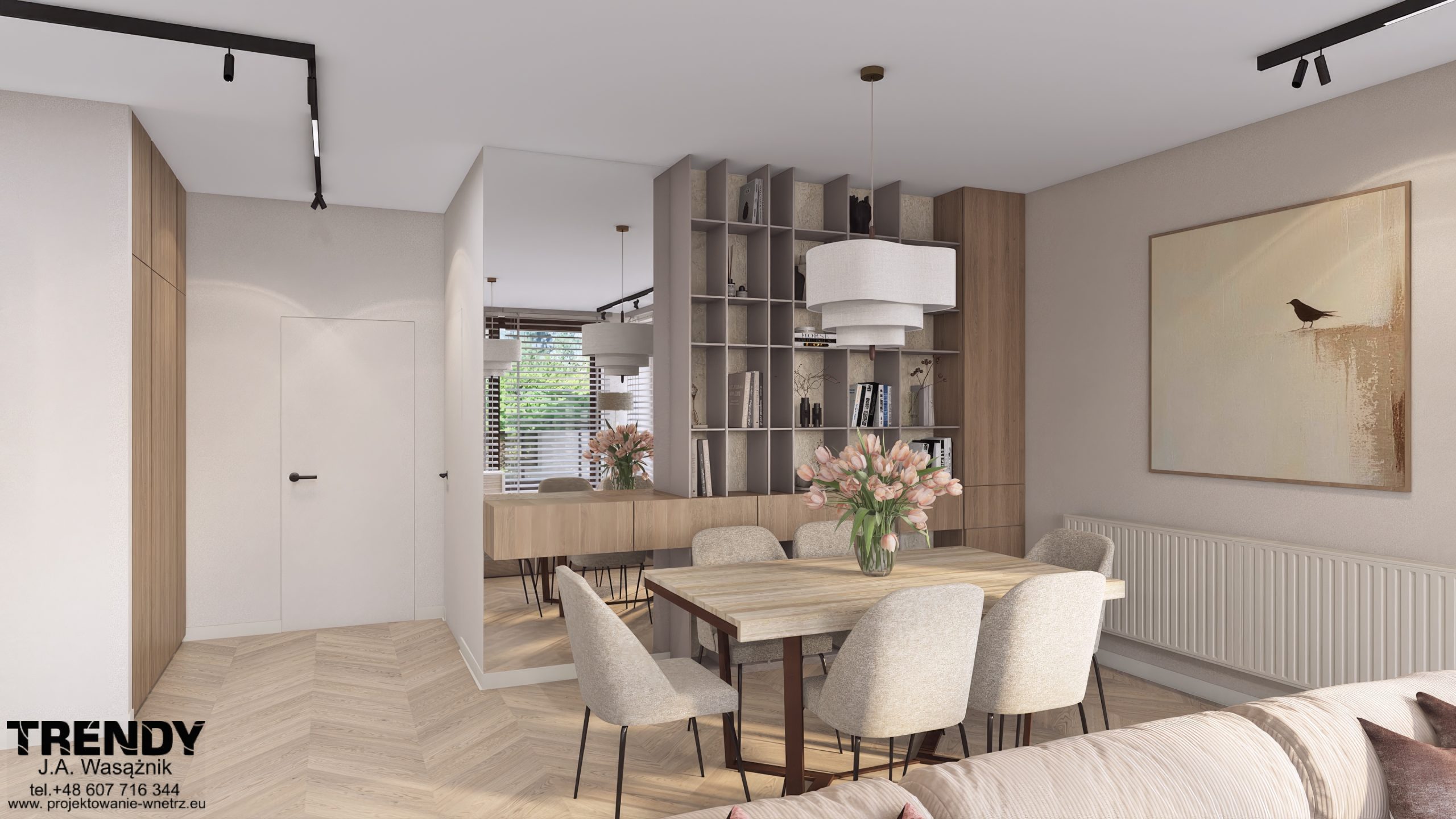 Otwarta przestrzeń dzienna, która jest kwintesencją nowoczesnej elegancji i przemyślanego designu, a jej siła tkwi w harmonii kolorów i materiałów. Wnętrze to charakteryzuje się neutralną i kojącą paletą barw, gdzie dominują ciepłe odcienie naturalnego drewna (dąb, beż) zestawione z jasnym kolorem szafek kuchennych oraz jasnymi, kremowymi tekstyliami obszernej sofy, co nadaje całości wyjątkowego ciepła. Elementy kontrastu, takie jak czarne detale szyn oświetleniowych i opraw lamp, wprowadzają nowoczesny, graficzny akcent, który podkreśla geometrię przestrzeni. Mimo otwartego planu, przestrzeń jest maksymalnie funkcjonalna dzięki wyraźnemu podziałowi na strefy w tle widzimy elegancki kącik jadalniany. Zastosowanie gładkich frontów w kuchni i wysoki regał w tle, będący jednocześnie biblioteczką i dekoracyjną ścianą, maksymalizują miejsce do przechowywania,. Całość dopełniają miękkie tekstury sofy, dywanu i bordowych poduszek, tworząc przytulne wnętrze. W mieszkaniu znajduje się ponadto : sypialnia i łazienka